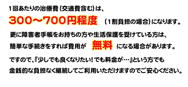 当院からの移動距離、保険負担割合により料金は変わりますが、おおむね1回あたりの治療費は300〜700円