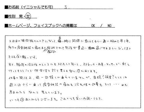 痛みやしびれがつらいといった悩みを抱え当院にお問い合わせやご依頼を受けています。