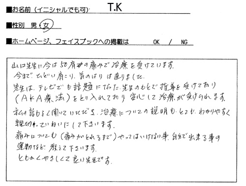また、その後勤務した大田区の整形外科では整形外科院長より関節包内運動療法(AKA療法)の指導を受け、無理のない関節可動域の改善、疼痛緩和手技を実際の治療に取り入れています。