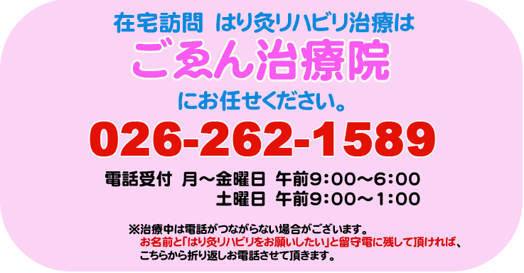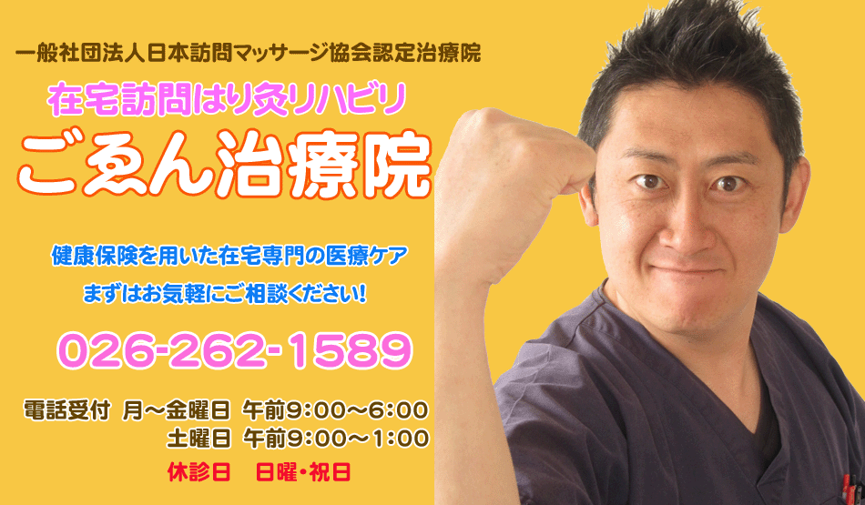 長野市の在宅訪問はり灸リハビリのごゑん治療院。長野市で健康保険適応のはり灸リハビリ治療を在宅訪問医療ケアで行っています。健康保険適応で脳梗塞後遺症、脊柱管狭窄症、椎間板ヘルニアの痛みに対するはり灸リハビリを自宅で受けられます。