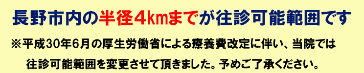 平成30年6月からはりきゅう及びあん摩・マッサージ・指圧に係る療養費の改定があり、当院では新規の患者様に対応できる往診可能範囲を当院より半径4kmとさせて頂きました。なお、現在当院の訪問治療を受けて頂いている患者様に関しては、4kmを超える範囲の方も今まで通り対応させて頂きます。